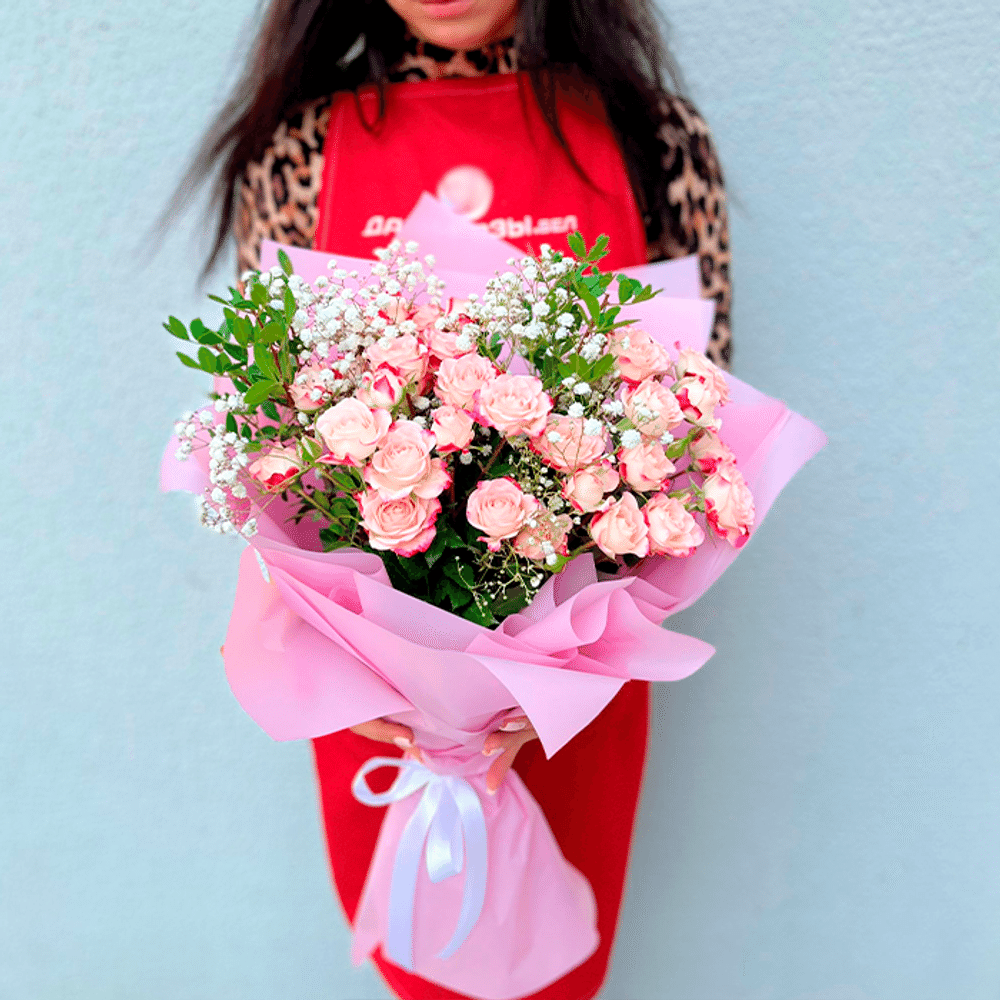 Состав: кустовая роза - 5 шт, зелень - 2 шт, гипсофила - 1 шт, диамант, лента (Голландия)