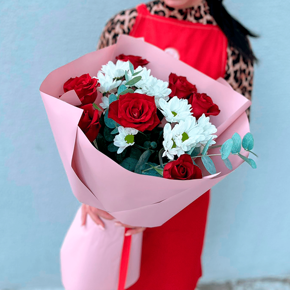 Состав: роза - 7 шт, хризантема - 2 шт, эвкалипт - 1 шт, диамант, лента (Голландия)
