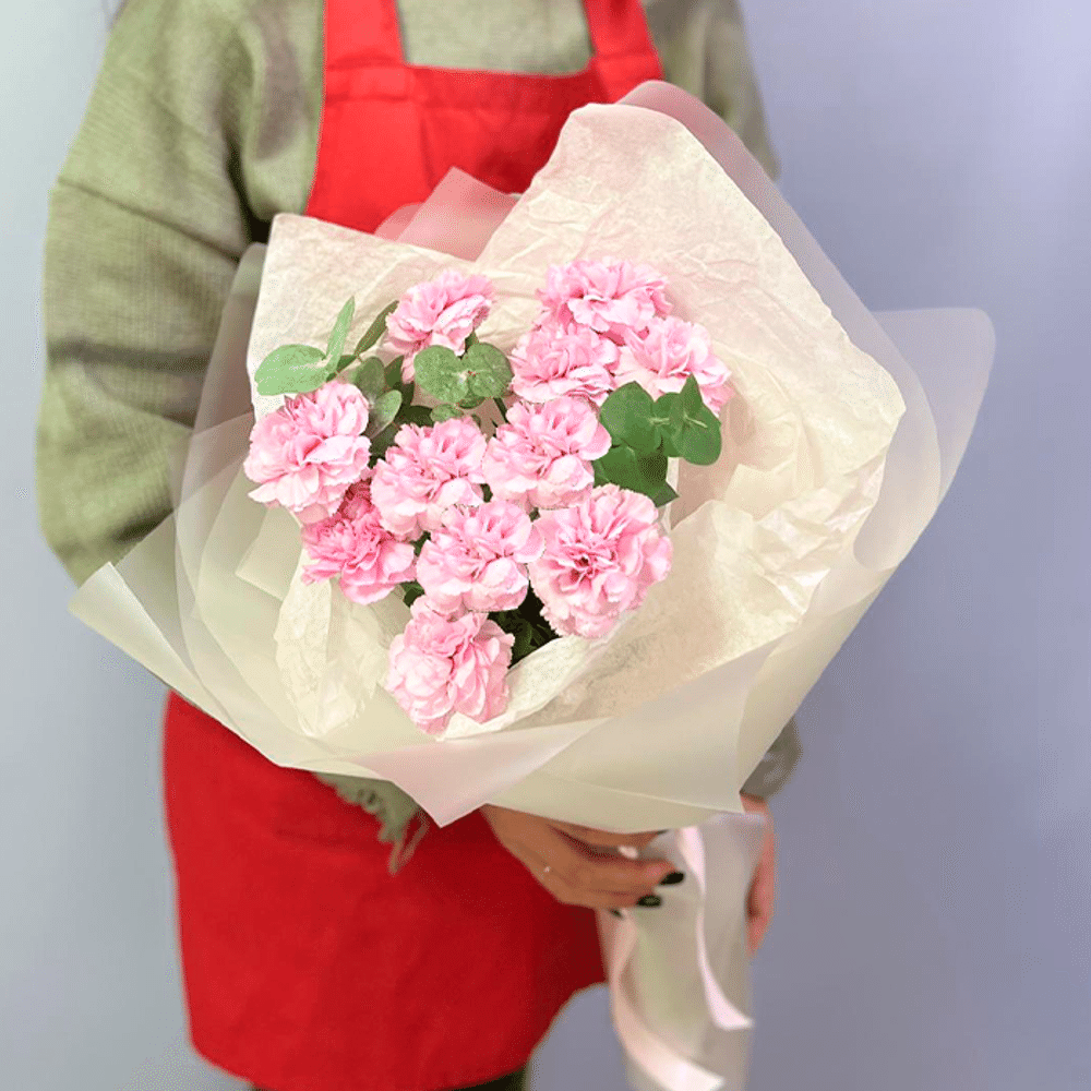 Состав: диантус - 11 шт, эвкалипт - 2 шт, тишью - 1 шт, диамант, лента (Голландия)