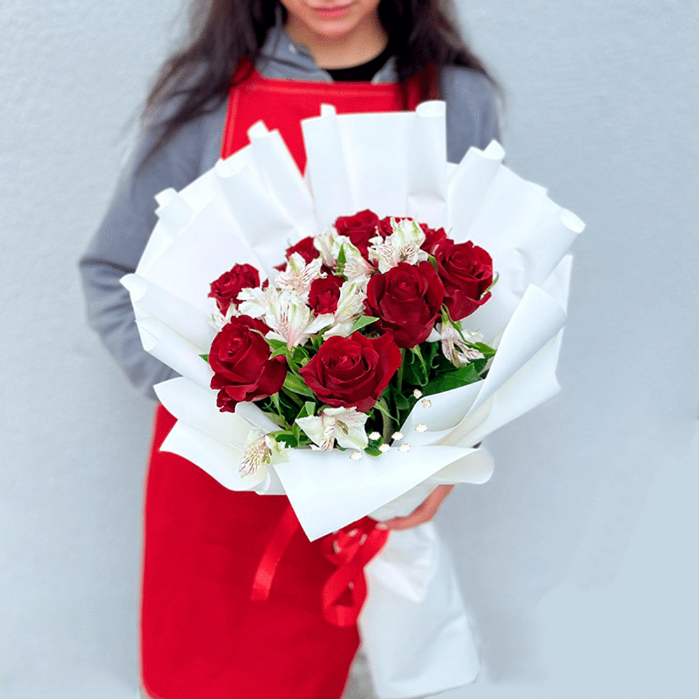 Состав: альстрёмерия - 4 шт, роза - 9 шт, диамант, лента (Голландия)