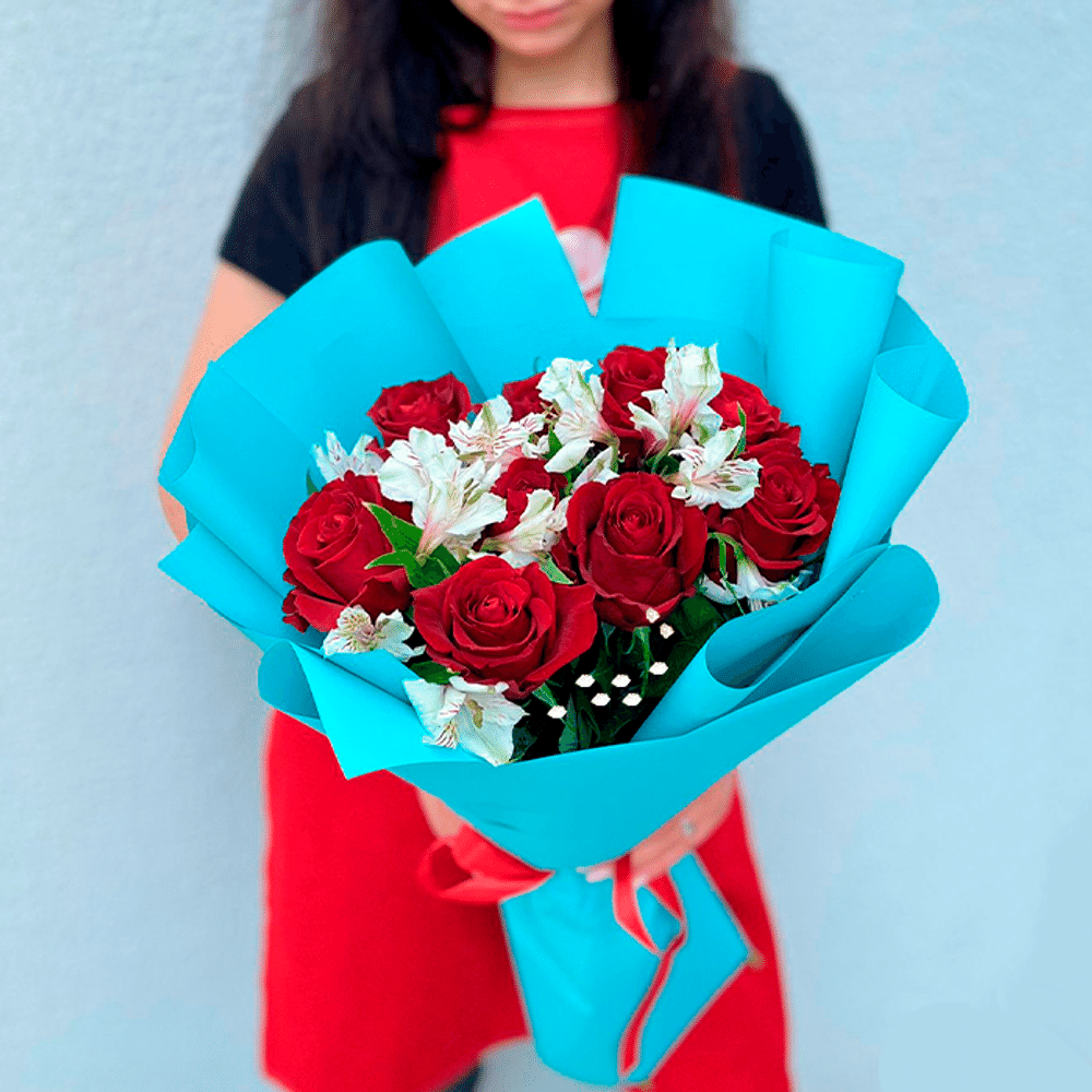 Состав: альстрёмерия - 4 шт, роза - 9 шт, диамант, лента (Голландия)