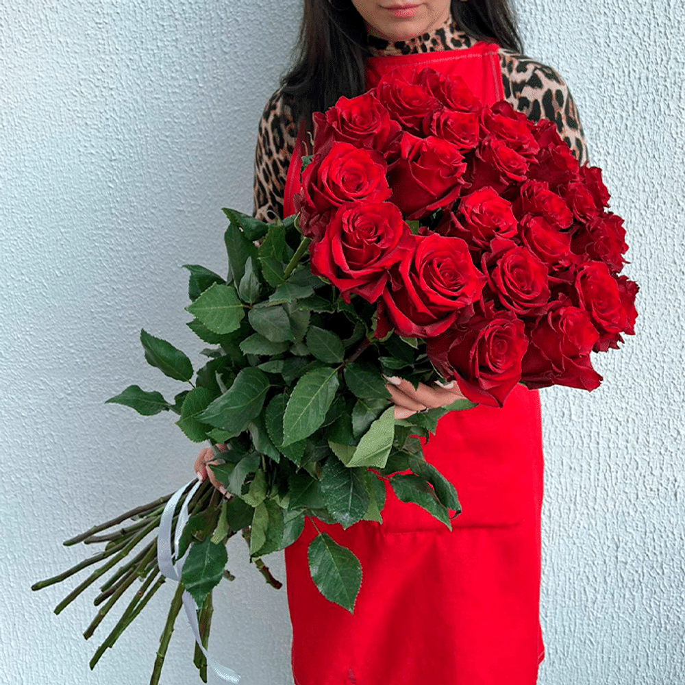 Состав: 25 роз от 90 до 100 см, лента (Эквадор)